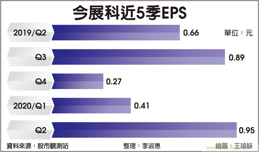今展科第二季获利达2,311万元,为歷史新高纪录,年增60%、季增157%,每股盈余0.95元,为7季以来新高纪录,累计今展科上半年EPS达1.37元,年增14.16%,以上半年获利进度来看,法人预期今展科今年EPS有望重返3元以上,为最近五年以来最佳获利水准。