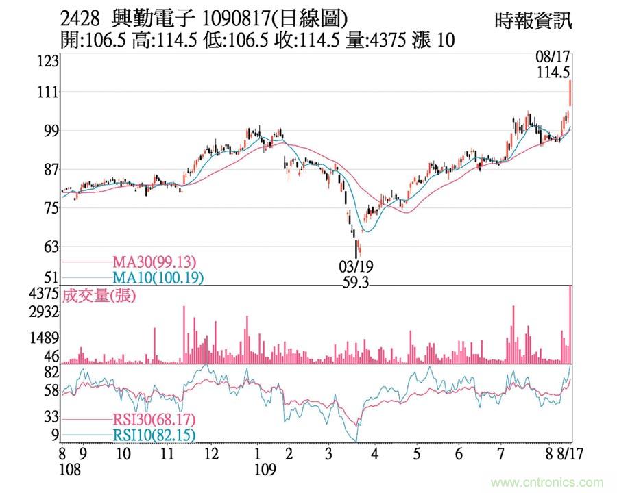 【导读】兴勤(2428)上季度财报优于预期,毛利率、营益率超越MLCC厂,累计上半年EPS达4.2元,由于获利超过禾伸堂,兴勤近日股价狂飙,17日正式超越禾伸堂,成为被动元件产业股价三哥,昨日收在114.5元,续创歷史新天价,提前替除息暖身。