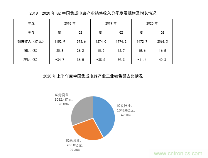 2020 年第二季度中国集成电路产业销售收入为 2066.3 亿元,同比增长 16.5%,环比大增 40.3%。