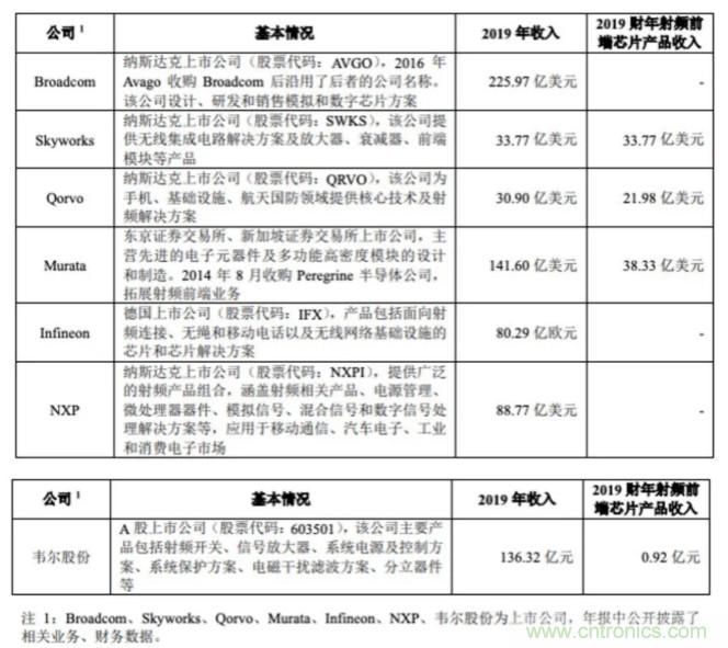 行业内主要芯片设计厂商一般同时向市场提供射频开关、射频低噪声放大器、射频功率放大器等多种产品。行业内主要竞争厂商包括欧美传统大厂Broadcom、Skyworks、Qorvo、NXP、Infineon、Murata 等,及国内竞争厂商紫光展锐、飞骧科技、唯捷创芯、韦尔股份等。