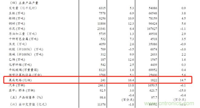【导读】10月19日,国家统计局发布前三季度经济报道。前三季度,全国规模以上工业增加值同比增长1.2%,上半年为下降1.3%。9月份,规模以上工业增加值同比增长6.9%,增速比8月份加快1.3个百分点。其中,前三季度,集成电路产量同比增长14.7%。