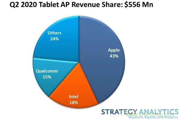 具体厂商方面,在2020年第二季度,苹果、英特尔、高通、联发科和三星LSI占据了平板电脑应用处理器(AP)收益份额的前五名,其中苹果以43%的收益份额领先,紧随其后的是英特尔(18%)和高通(15%)。