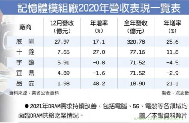 记忆体模组厂2020年营收表现一览表 ●2021年DRAM需求持续改善,包括电脑、5G、电竞等各领域均面临DRAM供给吃紧情况。图/本报资料照片