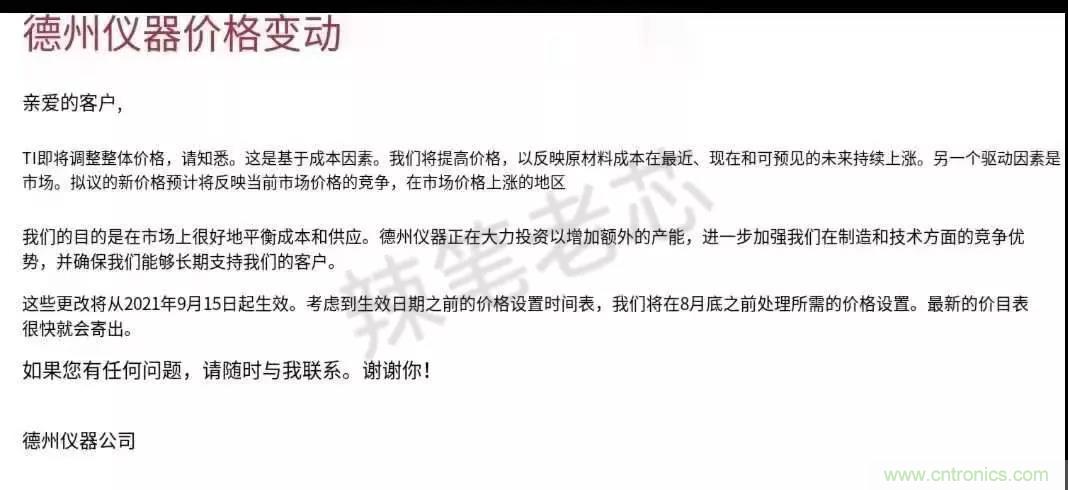 此外,有业内人士曝出全球模拟芯片龙头TI涨价通知:因原材料成本上涨等原因,将调整整体价格,新价格将自9月15日起生效。