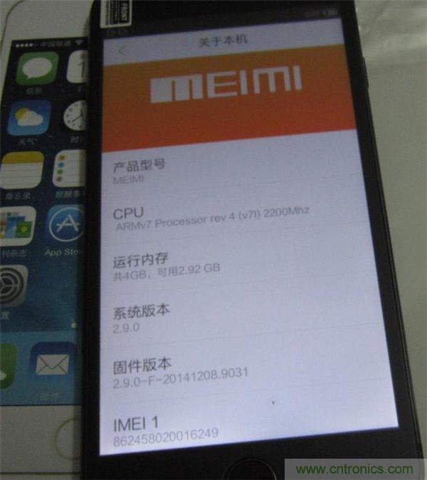 正面的苹果标志性HOME键。而开机时可以看到类似魅族的图标,仔细一看才发现这是MEIMI魅米而不是MEIZU魅族,这款机器尺寸为5.5寸,分别有金色与白色两种颜色的后盖。